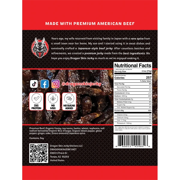Ignite your taste buds with Dragon Skin Jerky Hot Flavor. Made from premium USA beef, marinated in sake, and a fiery blend of Japanese spices, this high-end jerky offers an intense, spicy kick that’s sure to thrill. Savor the bold, authentic flavors of Dragon Skin Jerky and take your snacking to the next level.